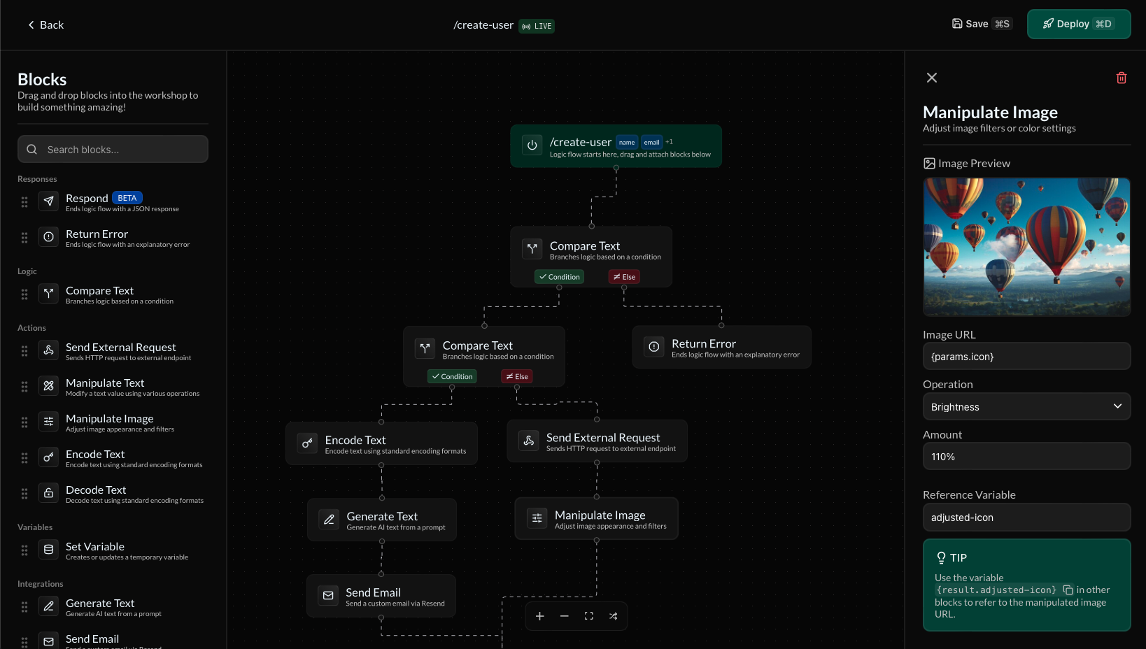 Drag and drop different blocks from the sidebar into the builder canvas to assemble and customize logic flows for your endpoints!